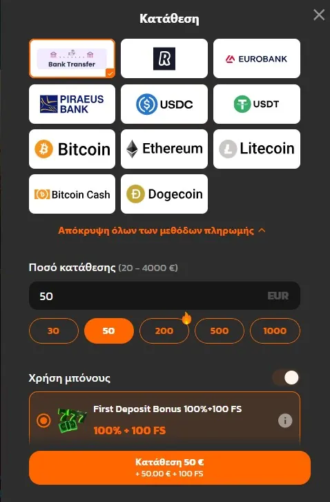 | Κύριες μέθοδοι πληρωμής | Visa, MasterCard, Skrill, Neteller, Revolut, Paysafecard |