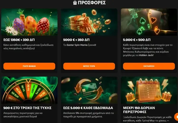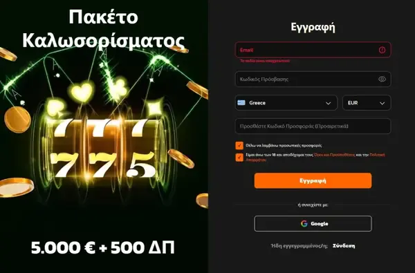 | Μπόνους καλωσορίσματος (σύνοψη) | Έως €5,000 + 500 Δωρεάν Περιστροφές σε 5 καταθέσεις (ισχύουν Όροι & Προϋποθέσεις) |